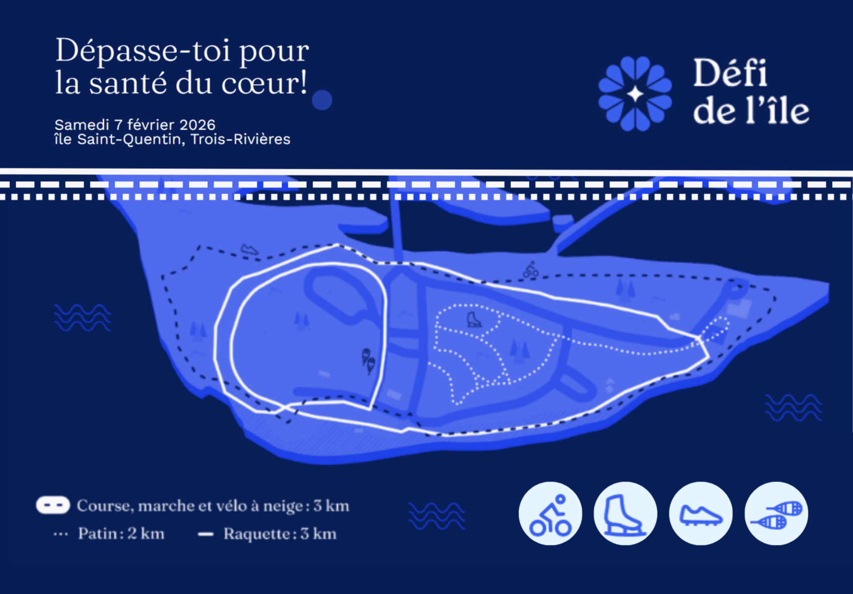 Pendant quatre heures, parcours l’un ou l’autre des différents circuits sportifs proposés afin de cumuler la plus grande distance possible. Chaque tour de l’île symbolise la circulation sanguine et chaque don amassé contribue à la santé cardiovasculaire!